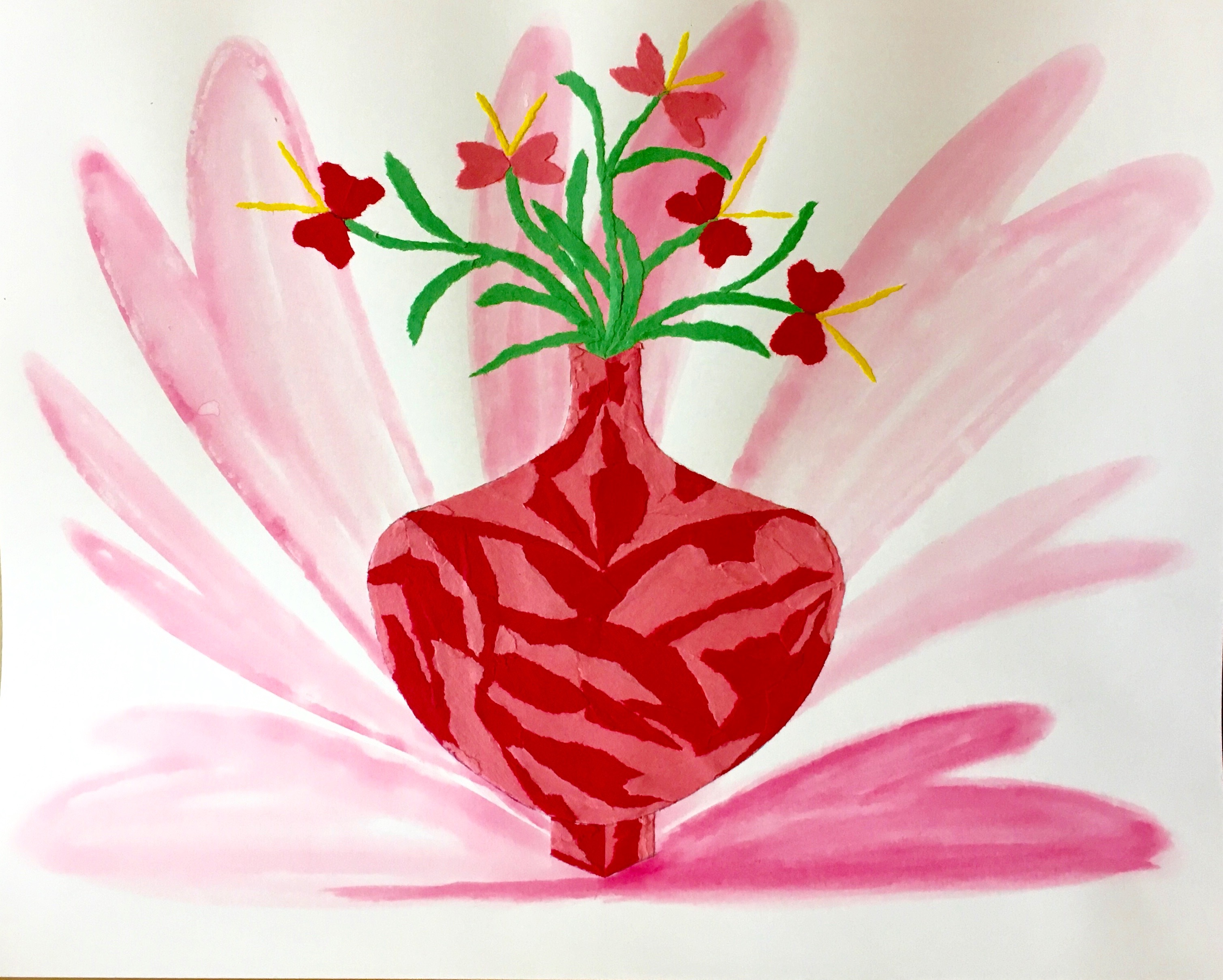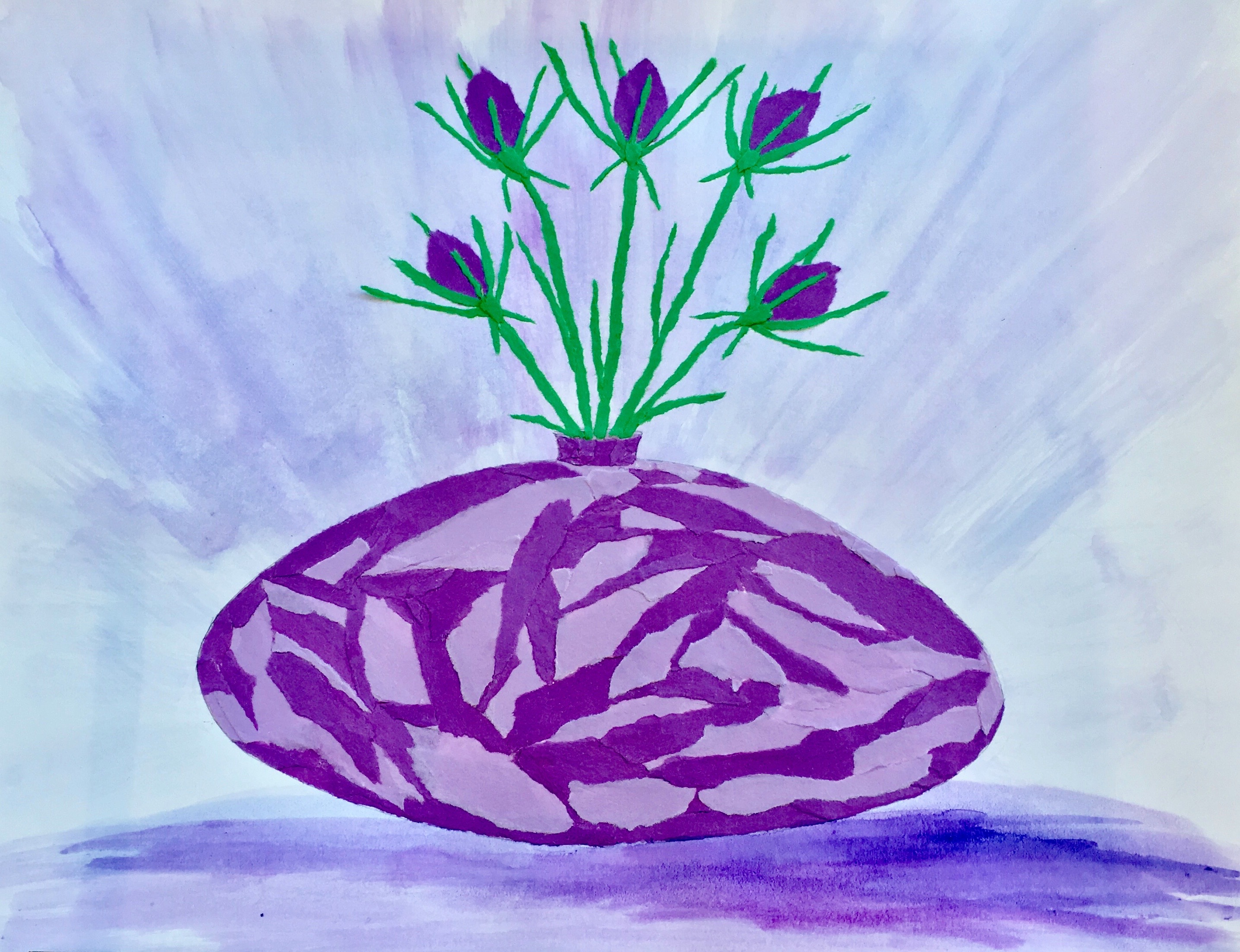 Inspired by her love of flowers, the collages she has created transcend a mix of the real and the imaginary to make colorful bouquets.  She paints her backgrounds with watercolors and uses torn and cut pieces of paper to craft her vases and the flowers that fill them.  The process involved in creating her collages has given her new purpose and has become her passion. This is Marion's collection of collages.