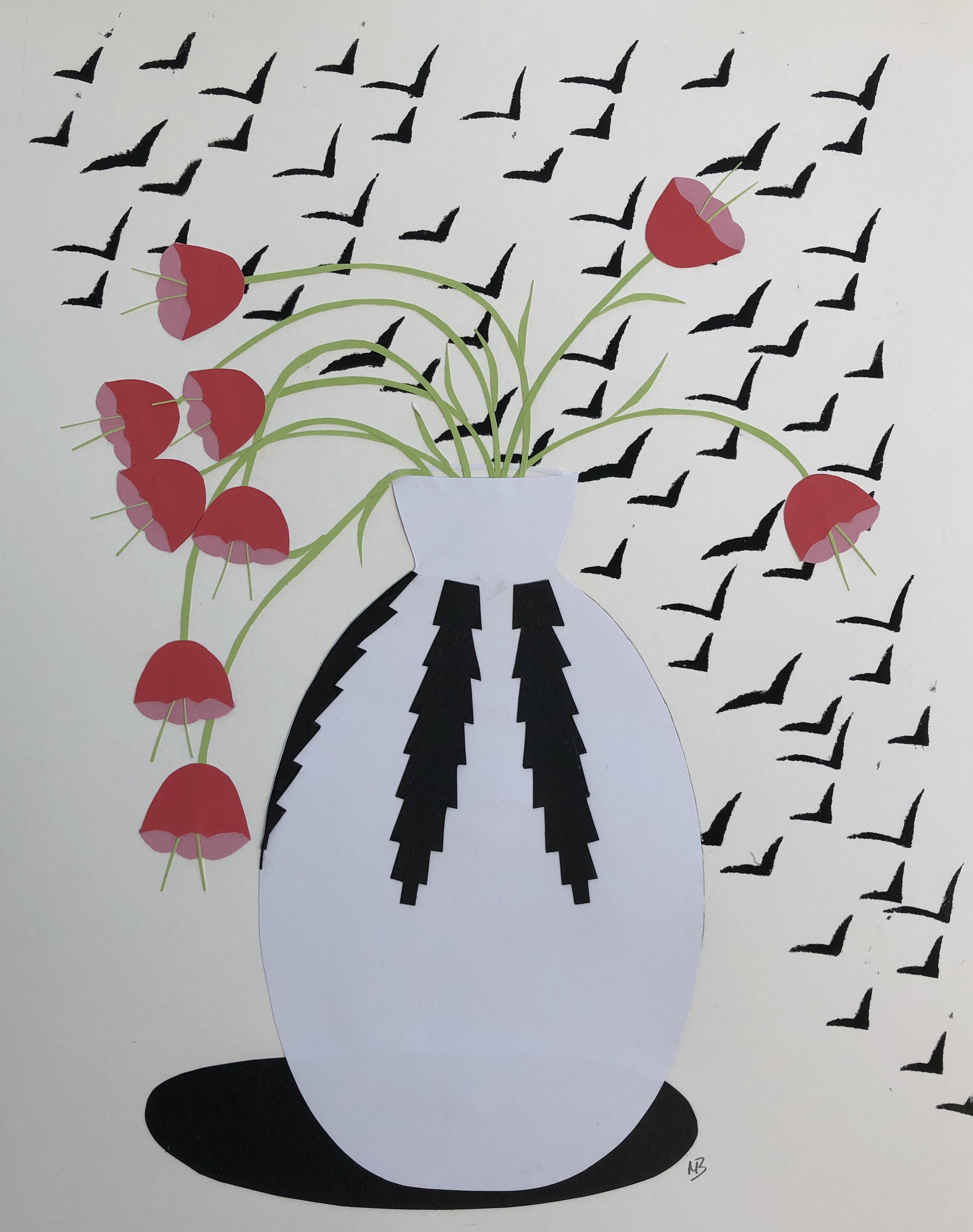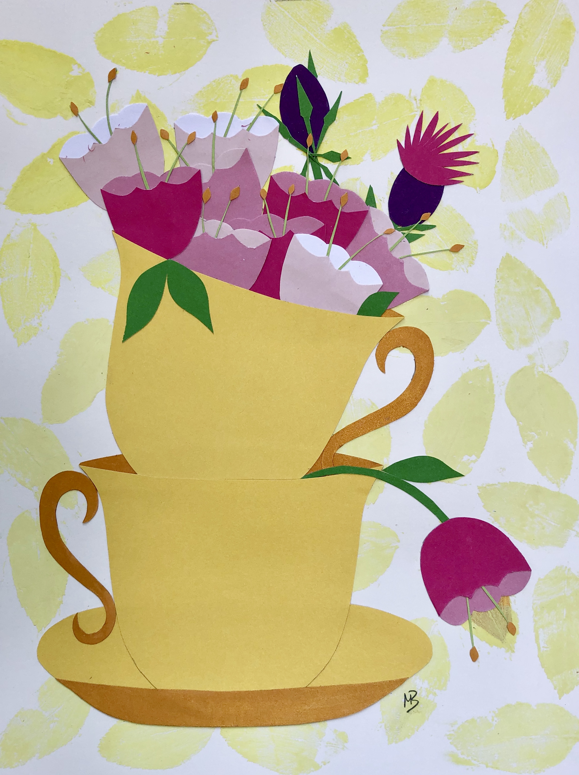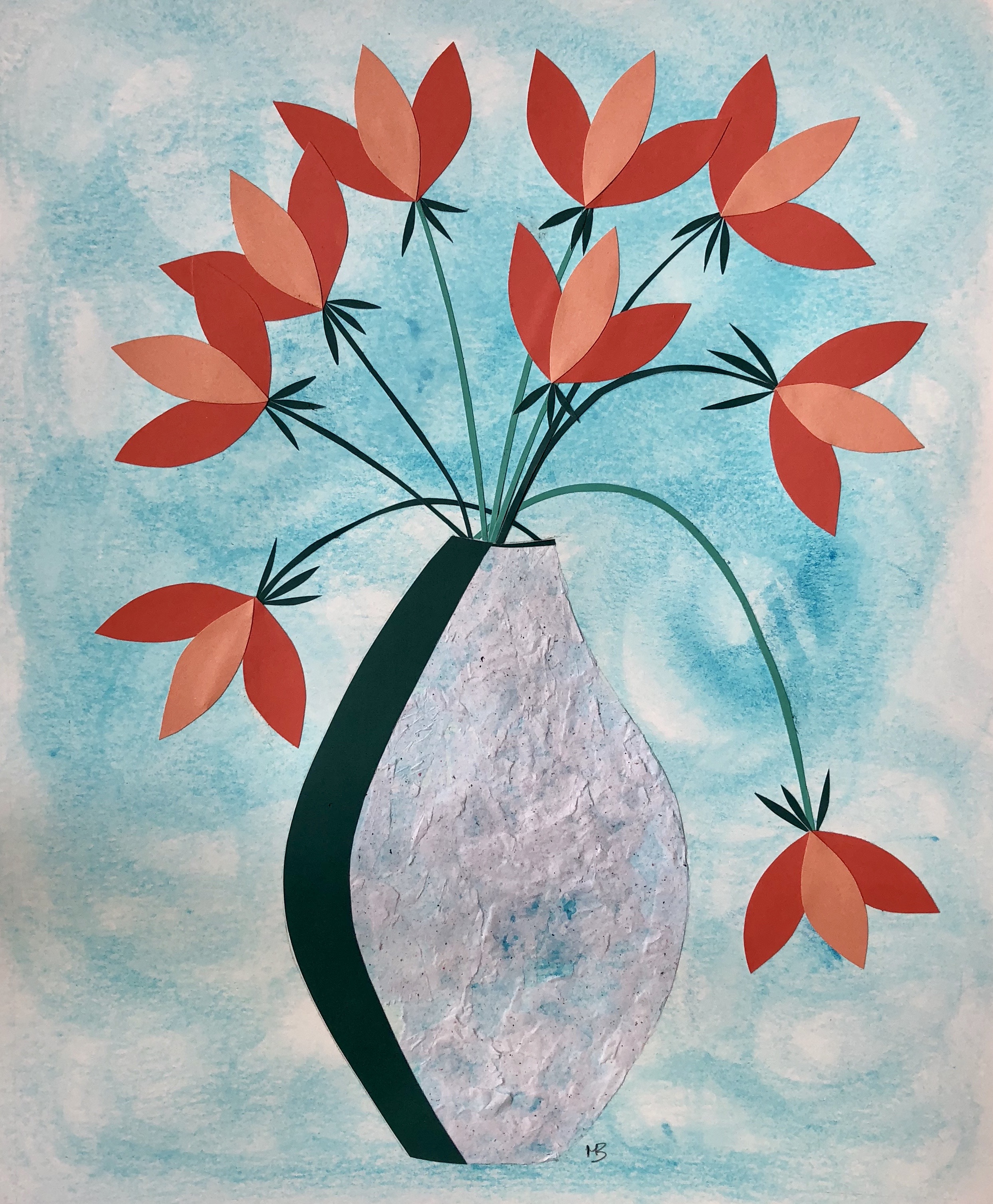 Inspired by her love of flowers, the collages she has created transcend a mix of the real and the imaginary to make colorful bouquets. She paints her backgrounds with watercolors and uses torn and cut pieces of paper to craft her vases and the flowers that fill them. The process involved in creating her collages has given her new purpose and has become her passion. When she finishes one, she cannot wait to start another!