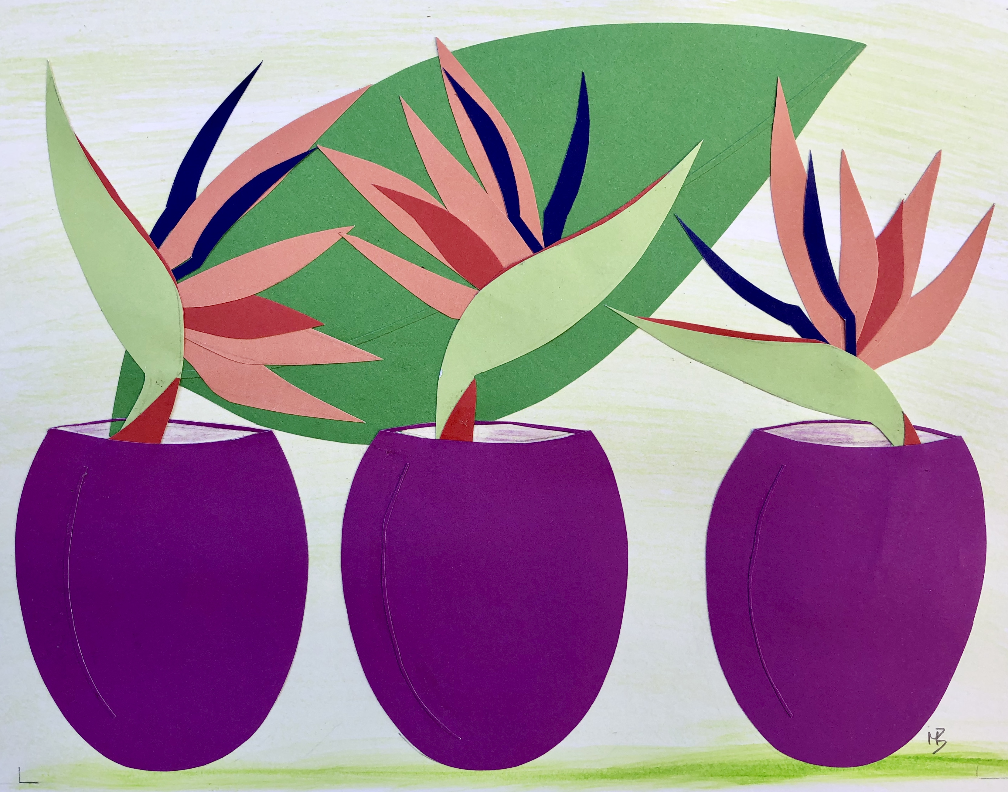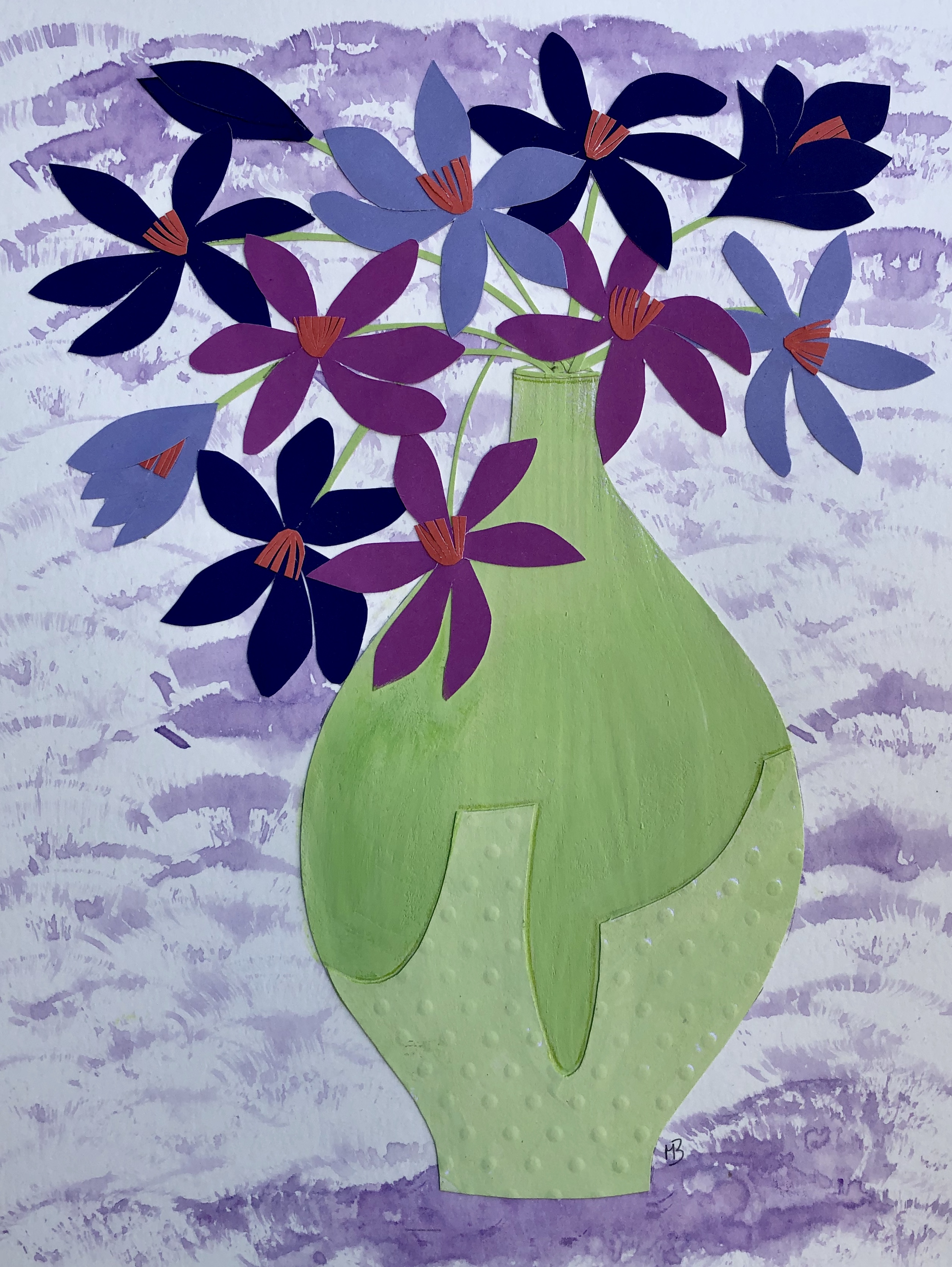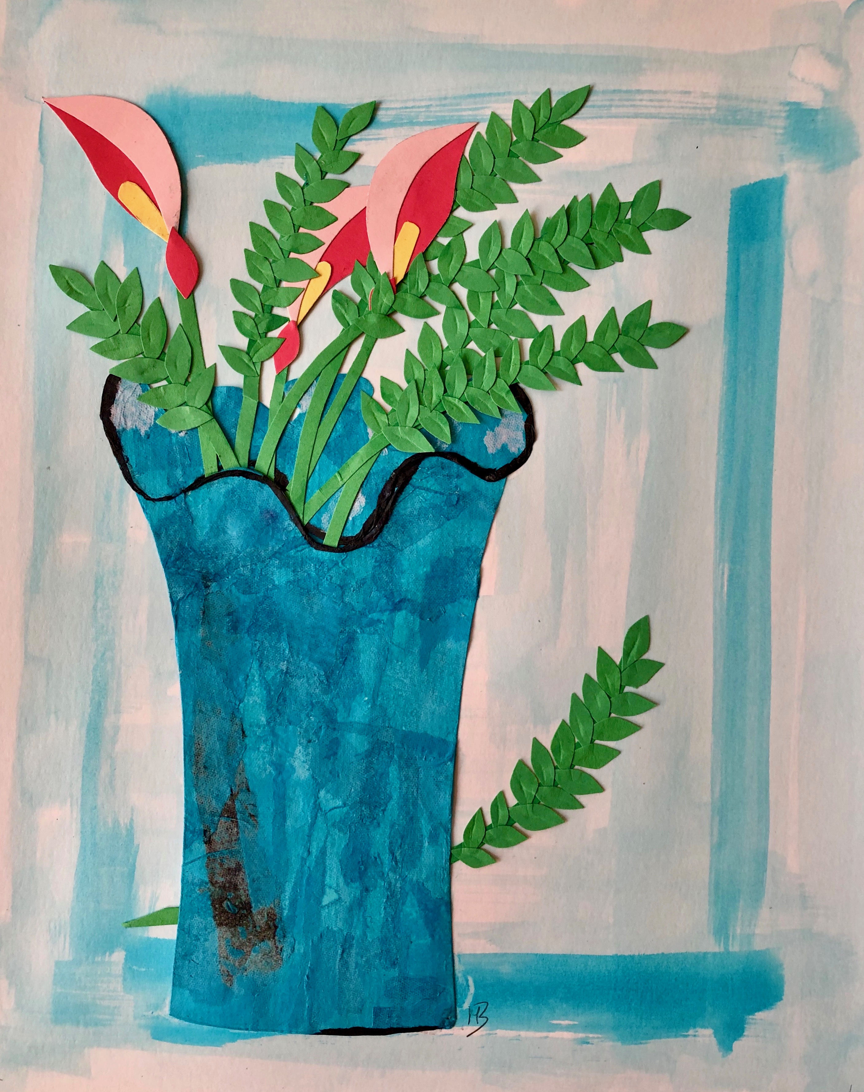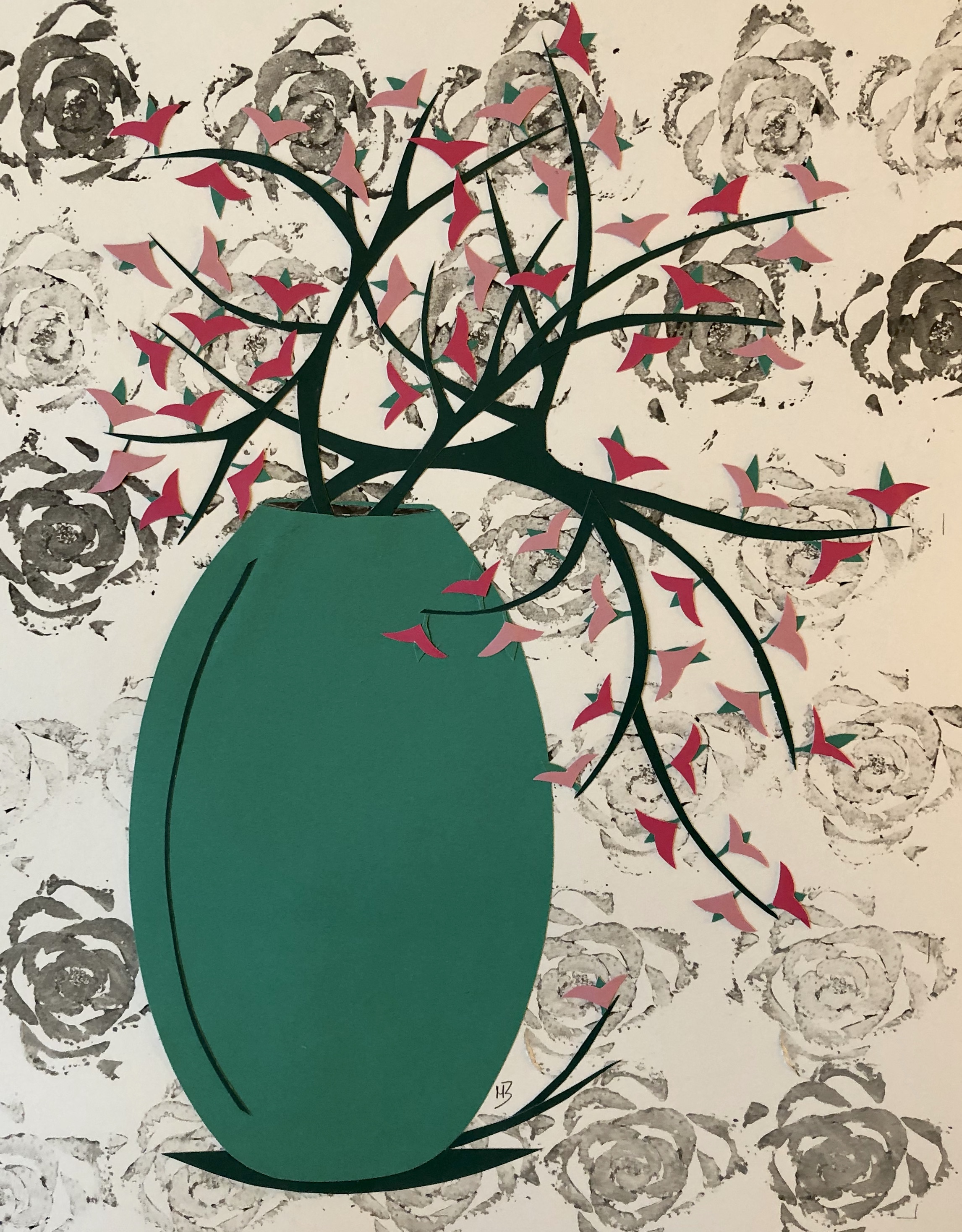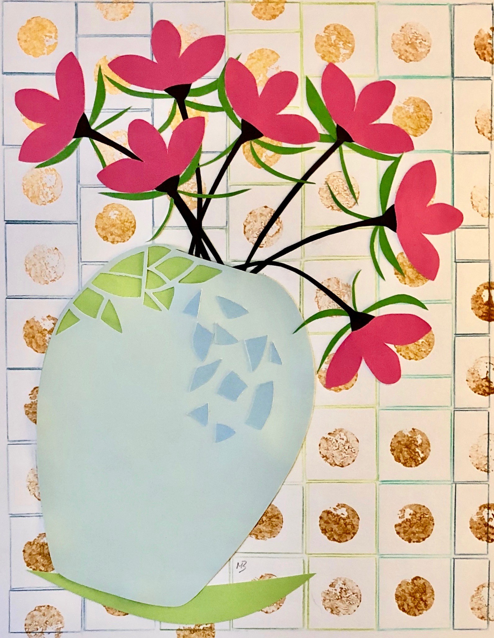Inspired by my love of nature, the collages I have created transcend a mix of the real and the imaginary to make colorful pictures. I paint and hand print my backgrounds with gouache and watercolors, and use torn and cut pieces of color paper to craft vases, flowers, birds and other elements of nature. The process involved in creating my collages has given me new purpose and has become my passion. This is my collection of collages.